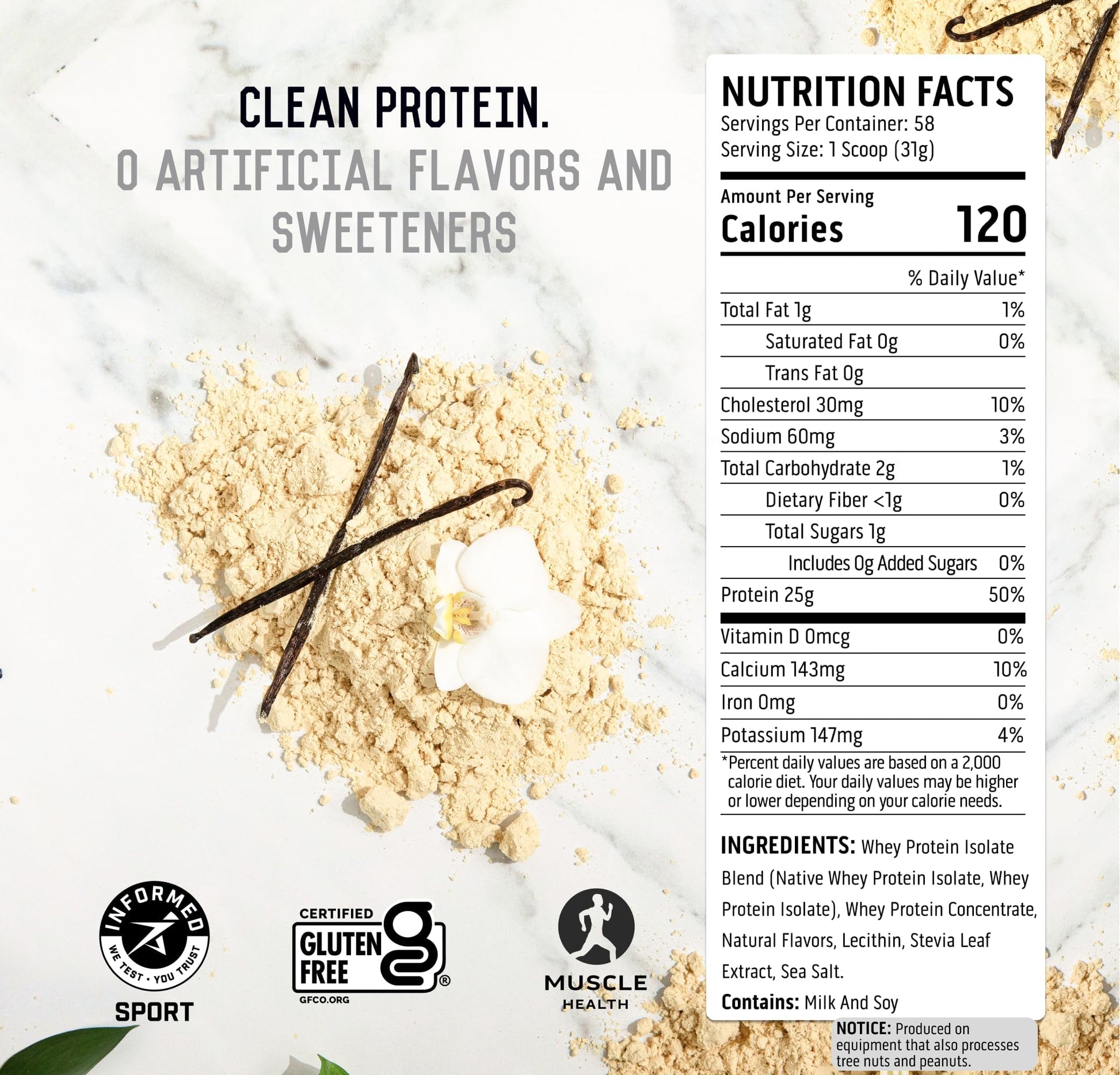 - 25g Protein Per Scoop - 5.5g Naturally Occurring BCAAs, and a clean, minimalist ingredient list. Certified Gluten Free and Informed Choice Certified. Lightly sweetened with stevia leaf extract.