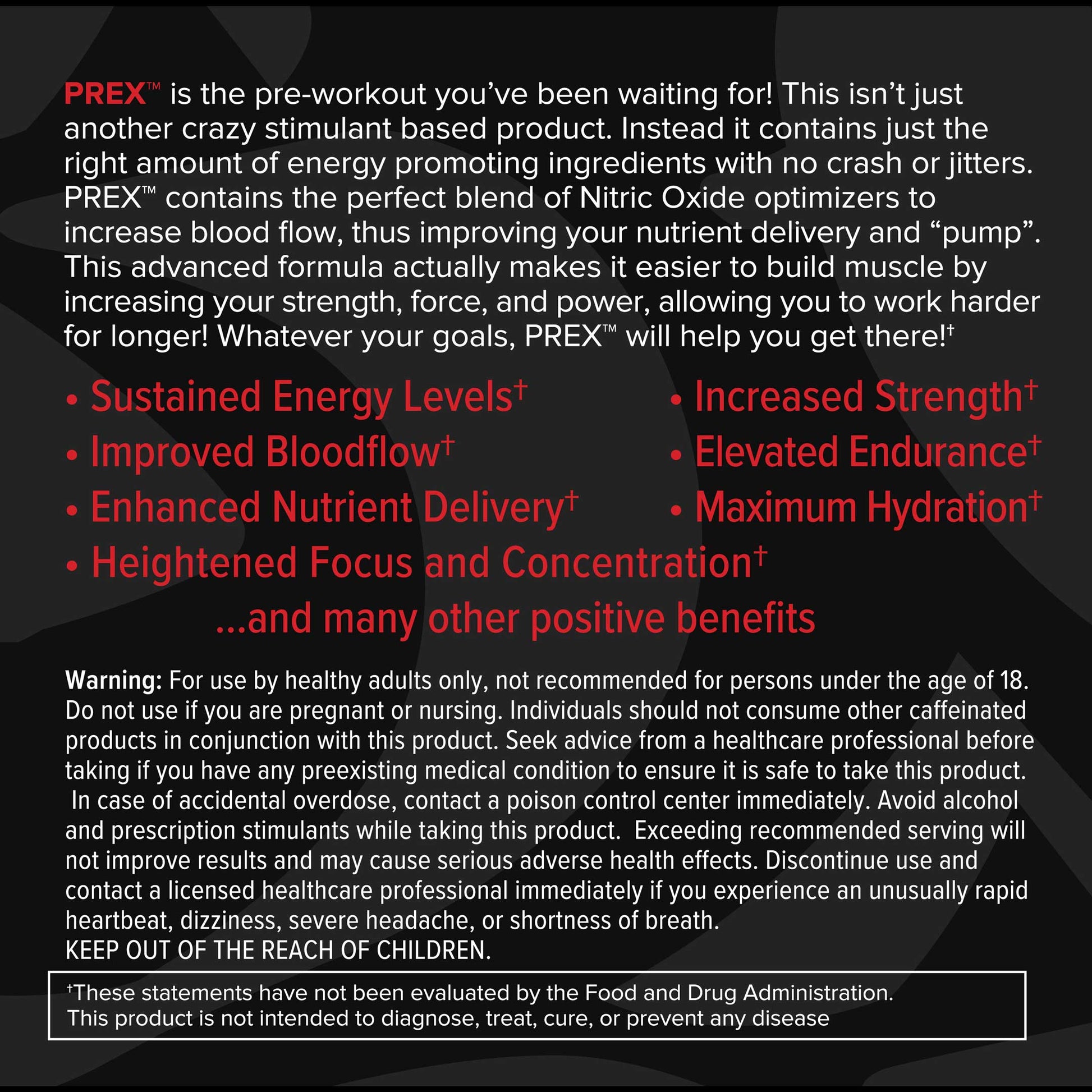 PREX is the pre-workout you've been waiting for! This isn't just another crazy stimulant based product. Instead it contains just the right amount of energy promoting ingredients with no crash, no jitters and no itchy ears.